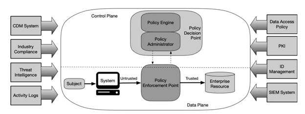 In a basic zero trust architecture, NIST defines three central components: the policy engine (PE), the policy administrator (PA), and the policy enforcement point (PEP).